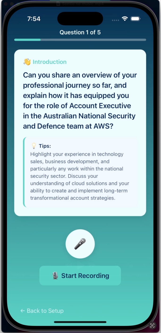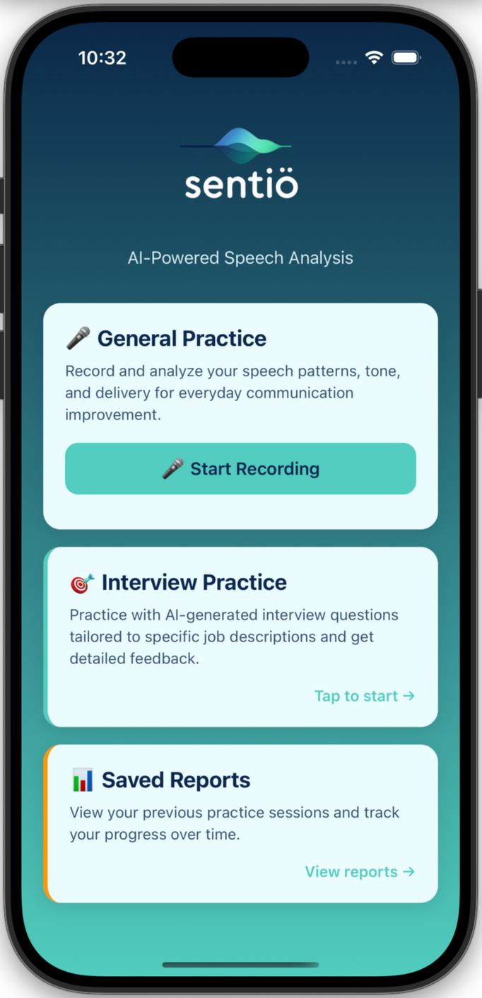 Record your answers directly in the app. Sentio will guide you with behavioral and technical questions.